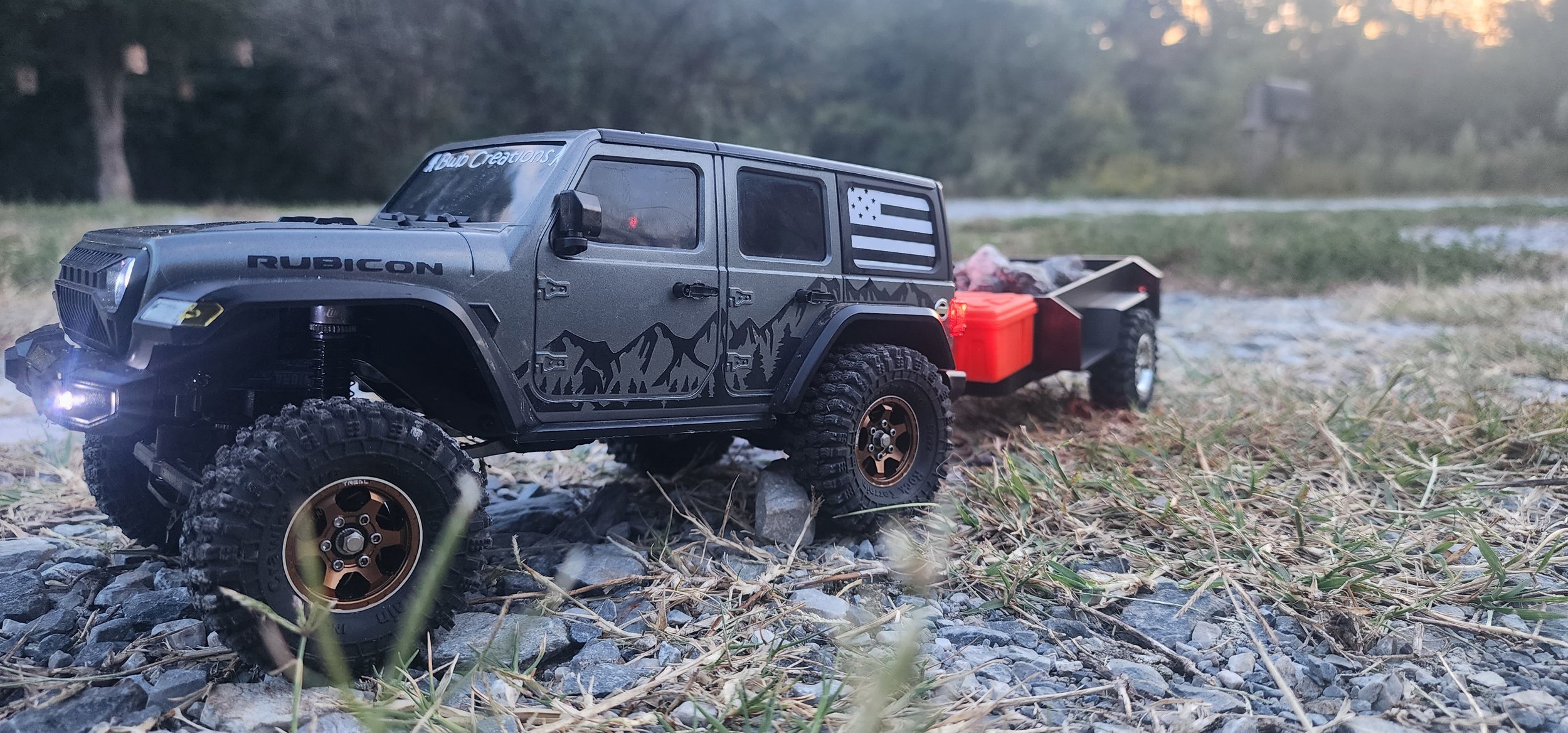 wanting something Bronze and not having 1010204738291q53412 bolts on the face side. Wanted something close to stock size as it looked scale to my liking. had to get wheel spacers to use the rims as they wobbled from being a loose fit and I couldn’t tighten the lugs any tighter. Tires are INJORA 1.0 Tires - 57 * 22mm S5 Super Soft Sticky Crawler Tires. Rims are from TREAL SCX24 Wheels 1.0" Beadlock Wheels. The TREAL Brass Wheel Hubs.
